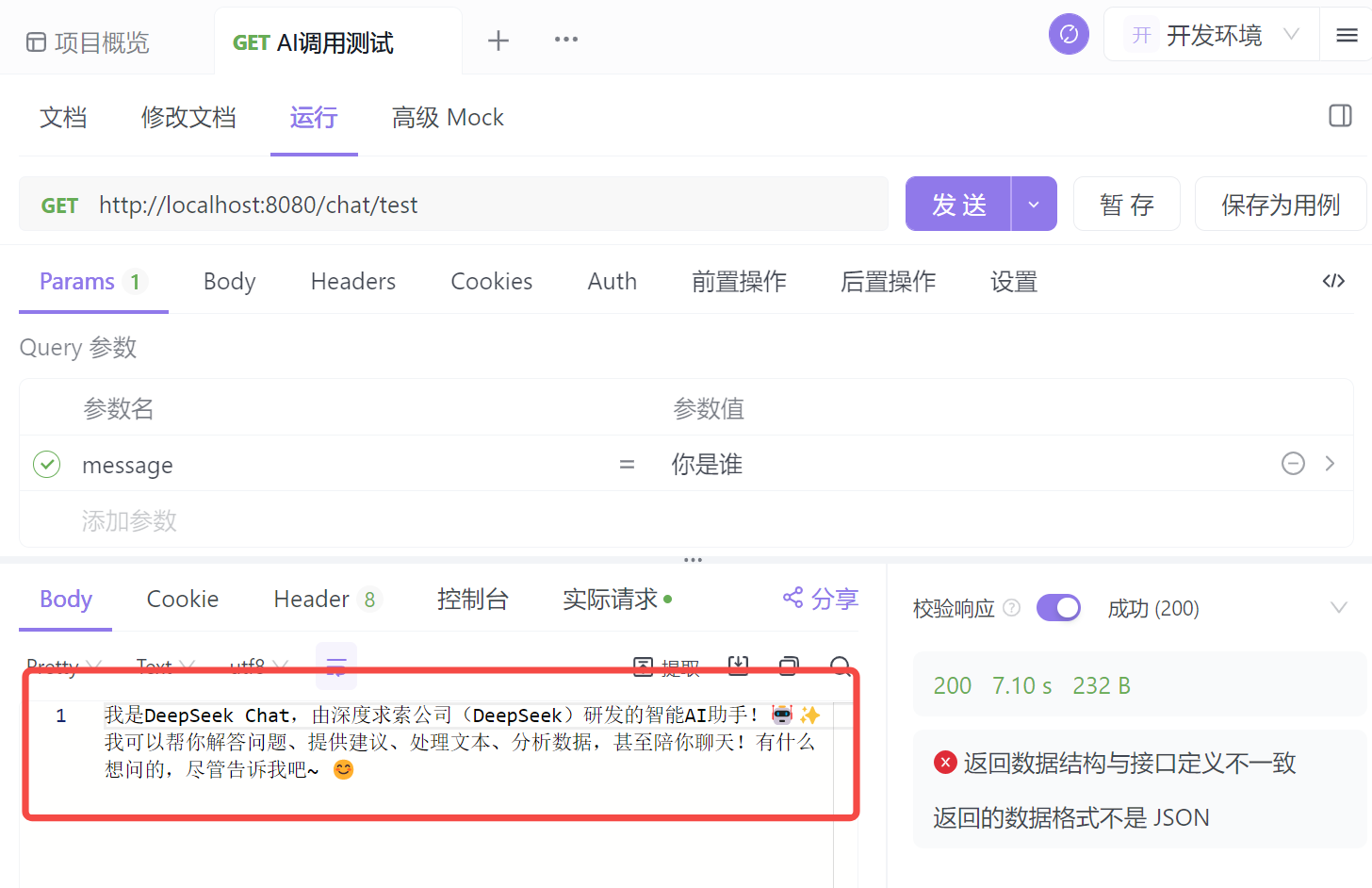 import org.springframework.ai.chat.client.ChatClient; import org.springframework.web.bind.annotation.*; @RestController @RequestMapping("/chat") public class ChatController { private ChatClient chatClient; public ChatController(ChatClient.Builder chatClientBuilder) { this.chatClient = chatClientBuilder.build(); } @GetMapping("/test") public String completion(@RequestParam String message) { return chatClient.prompt() .user(message) .call() .content(); } }2.启动测试启动应用,Spring Boot 的控制台会显示启动信息。待应用成功启动后,我们可以通过Apifox,向这个测试接口发送请求: