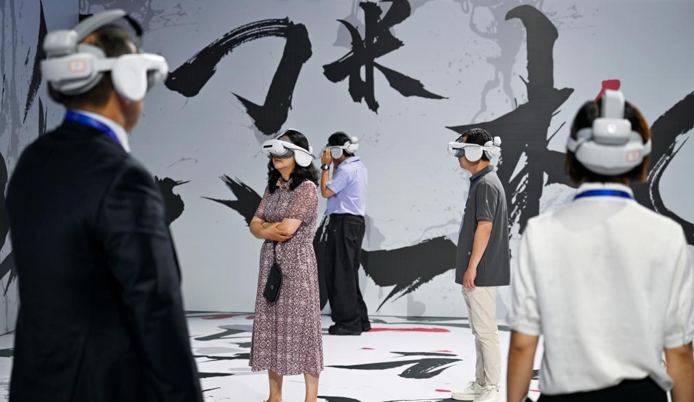 2025年7月4日,重庆永川国际会展中心,嘉宾观看中国电影科技企业的虚拟影片。新华社记者 陈诚 摄