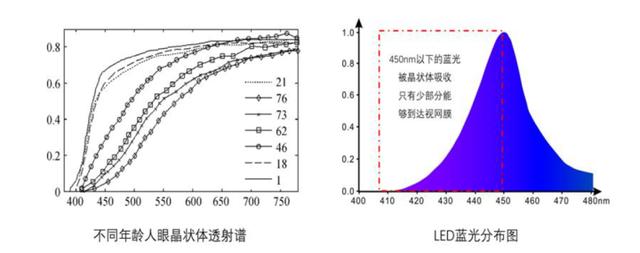 从不同年龄人眼晶状体透射谱来看,无论是什么年龄的人,人眼晶状体透射率在445nm以上的均要大于445nm以下的。这说明445nm以下的蓝光能够穿透晶状体到达视网膜上会很少,这个波段的蓝光能量已经被晶状体和角膜大部分地吸收阻隔掉了。