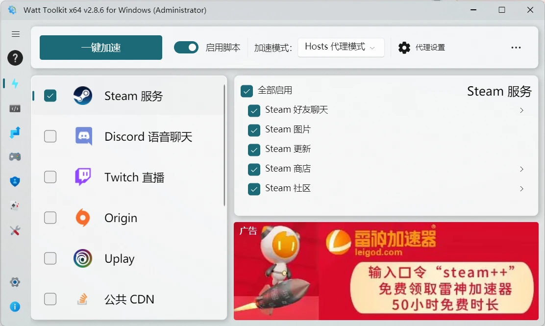 「Watt Toolkit(原名Steam++)」是一个开源跨平台的多功能 Steam 工具箱。可以用来连接“Steam服务”,欧博“Origin”,“Nexus Mods”,“微软OneDrive”以及其他网站,并且免费。
