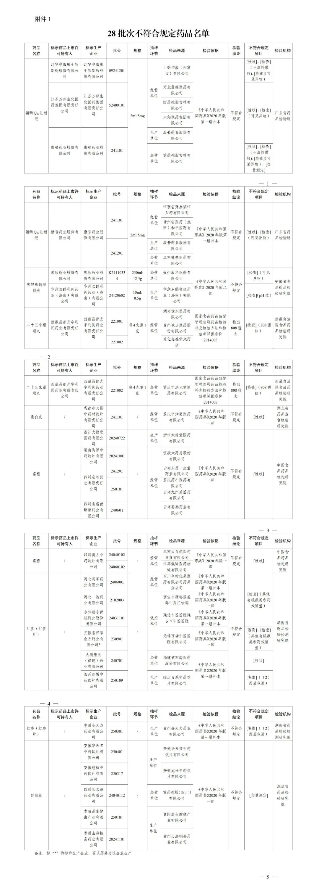 经深圳市药品检验研究院检验,标示为安徽华天宝中药饮片有限公司、安徽旭松中药饮片有限公司、四川禾木源药业有限公司、贵阳道生健康产业有限公司、贵州山海桐嘉药业有限公司生产的共5批次野菊花不符合规定,不符合规定项目为含量测定。
