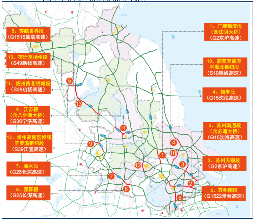 通过对全省高速公路节假日交通运行情况的跟踪监测,部分高速公路路段受单向车辆集中影响,多年以来高峰时段车流量严重饱和,出现较为严重的交通拥堵。平日大流量路段主要集中在苏南地区,2026年春节期间,预计有13个路段高峰时段易拥堵缓行,车速不足50公里/小时。