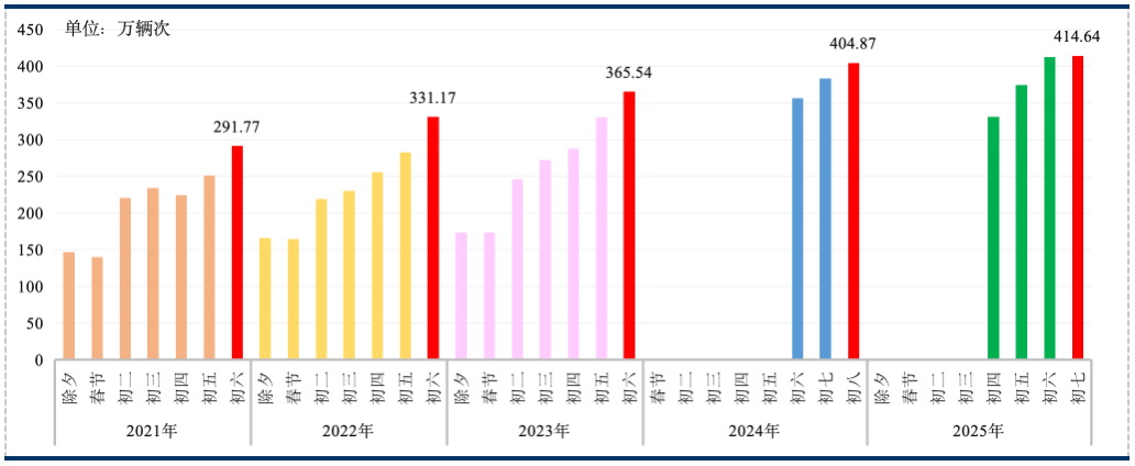随着公众出行习惯发生深刻结构性变化,叠加春节假期免收小客车通行费时长增加、中长距离出行增加等因素,小客车流量较往年有所增加,预计约334万~350万辆次,其中,春节最后一天小客车流量更是有望达到427万辆次,达到历史最高峰。