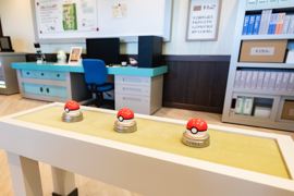 Our journey began with a trip into the Pokémon Research Lab near the five Pokémon friends. Fans who have played Pokémon games will feel quite at home here. Inside is a cylindrical machine containing six Poké Balls, shelves full of books, a large table covered with research material (as well as a Pokémon Egg!), and—of course—a smaller table with three Poké Balls from which prospective Trainers would choose their first partner Pokémon.