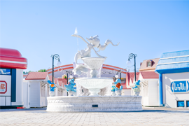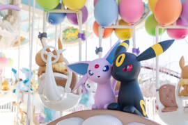Vee Vee Voyage is an absolutely gorgeous carousel where guests can ride alongside Eevee and its Evolutions in carriages and seats, which are held aloft by balloons, or ride atop Ponyta or Rapidash (in both Kantonian and Galarian varieties). It’s a classic ride given a glorious Pokémon makeover. The top of the carousel is adorned with incredible stained glass–style artwork of Eevee and its Evolutions, and it’s topped off with a lovely gold Eevee statue. Oh, and be sure to look for the special manhole cover near Vee Vee Voyage that features Pikachu and Eevee in their carnival outfits!