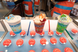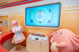 Flanking the fountain are a Pokémon Center and a Poké Mart. These familiar buildings look amazing, but they’re functional, too. Pop into the Pokémon Center, and you’ll be greeted by Chansey and the ever-present Pokémon Center receptionist. It’s a thrill to experience the moment when you hand over a set of Poké Balls for her to restore to full health in the Healing Machine. The Poké Mart has a variety of refreshing beverages for sale, including adorable (and delicious!) specialty drinks themed after the Kanto region’s first partner Pokémon. Also on the menu are cookies decorated with pixel art of Poké Balls, Potions, and Full Heals.