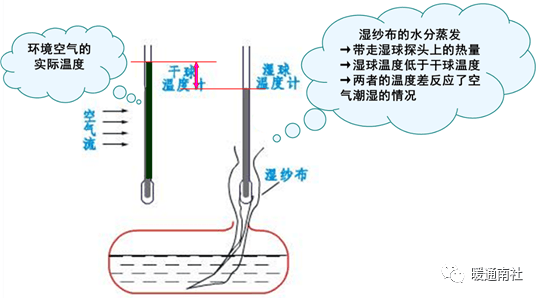 湿球探头用湿纱布包裹着,环境空气越干燥,湿球外边的湿纱布的水分蒸发就越快。水分蒸发带走的湿球温度计探头上的热量,湿球温度低于环境空气的温度;