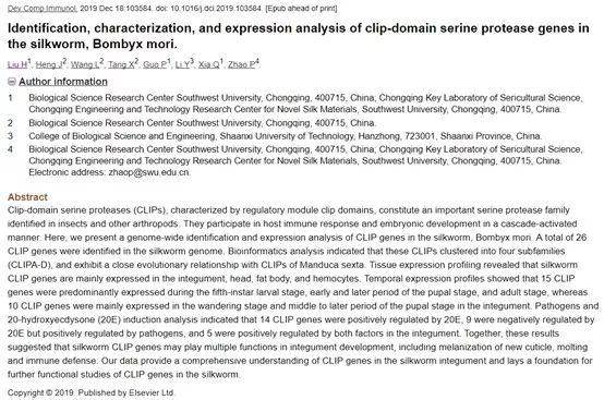 摘要:Clip结构域丝氨酸蛋白酶(CLIPs)是在昆虫和其他节肢动物中鉴定到的一个重要的丝氨酸蛋白酶家族,欧博allbet其主要特征为含有调控模块clip结构域。这类蛋白酶以级联激活的方式参与宿主的免疫反应和胚胎发育.在这项研究中,作者对家蚕的CLIPs进行了全基因组鉴定及表达分析。在家蚕基因组中共鉴定出26个CLIPs基因。生物信息学分析表明,这些CLIPs在进化上可聚成4个亚家族(CLIPA-D),并与烟草天蛾的CLIPs有着较近的进化关系。组织表达谱显示,家蚕CLIPs基因主要在体壁、头部、脂肪体和血细胞中表达。在体壁中的发育时期表达分析表明15个CLIPs主要在5龄幼虫期、蛹的早期和后期以及成虫期表达,而10个CLIPs基因则主要在上蔟期和蛹的中后期表达。进一步在体壁中的病原菌和蜕皮激素(20E)诱导分析发现, 14个CLIPs基因受到20E的诱导上调;9个CLIPs基因被20E诱导下调,但受到病原菌的诱导上调;5个CLIPs基因同时受到病原菌和20E的诱导上调。以上的研究表明,家蚕CLIPs基因可能在体壁发育中发挥了多种功能,包括新表皮的黑化、蜕皮和免疫防御等。这项研究提供了对家蚕CLIPs基因在体壁中表达模式的全面认识,为进一步研究家蚕CLIPs基因的功能奠定了基础。